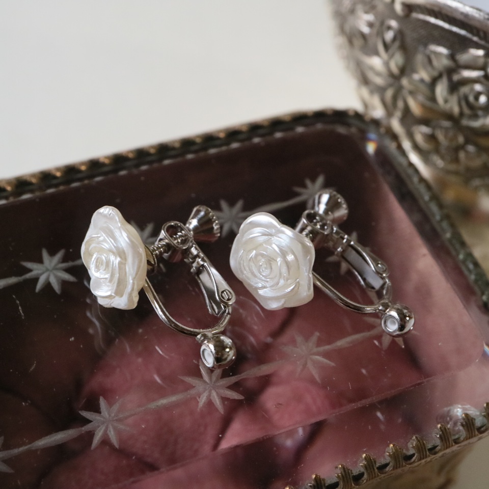 パール塗装されたバラの花が一輪、耳元に寄り添います。