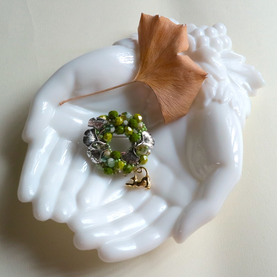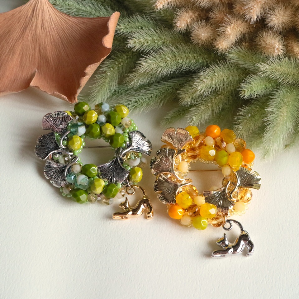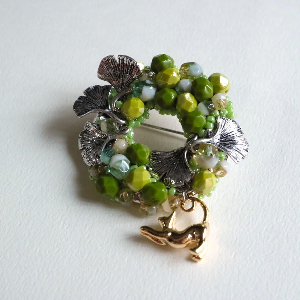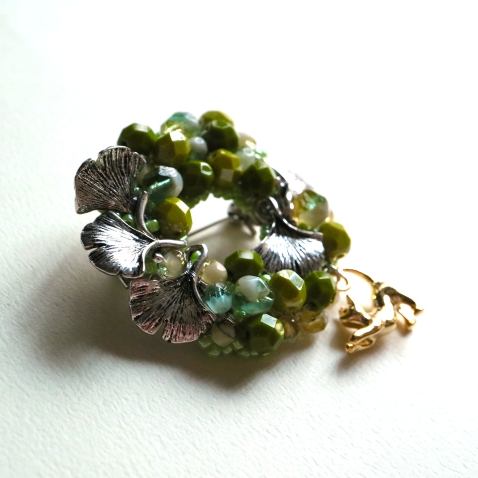 チェコビーズを集めて表したリースブローチです。