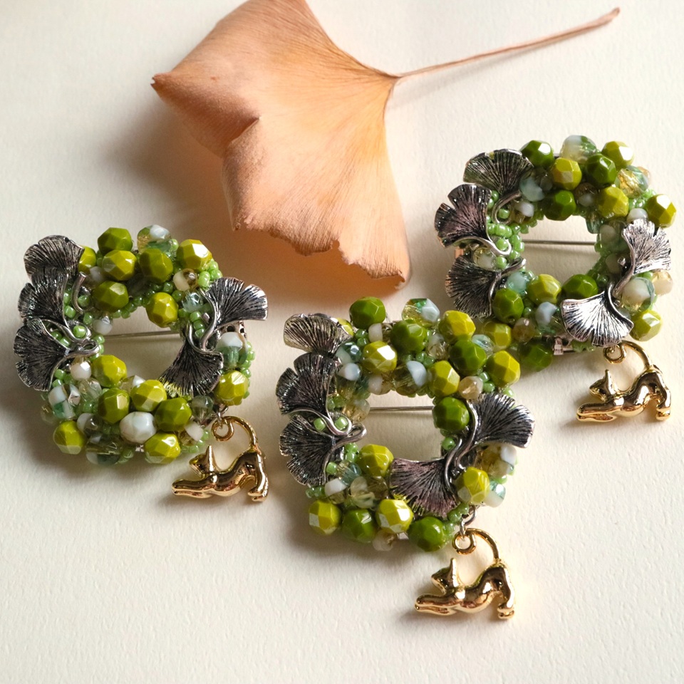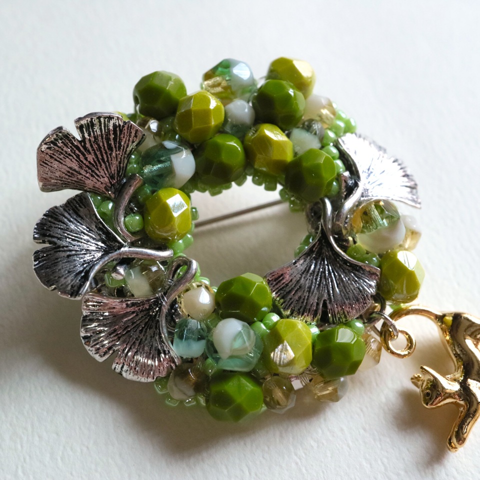 チェコビーズを集めて表したリースブローチです。